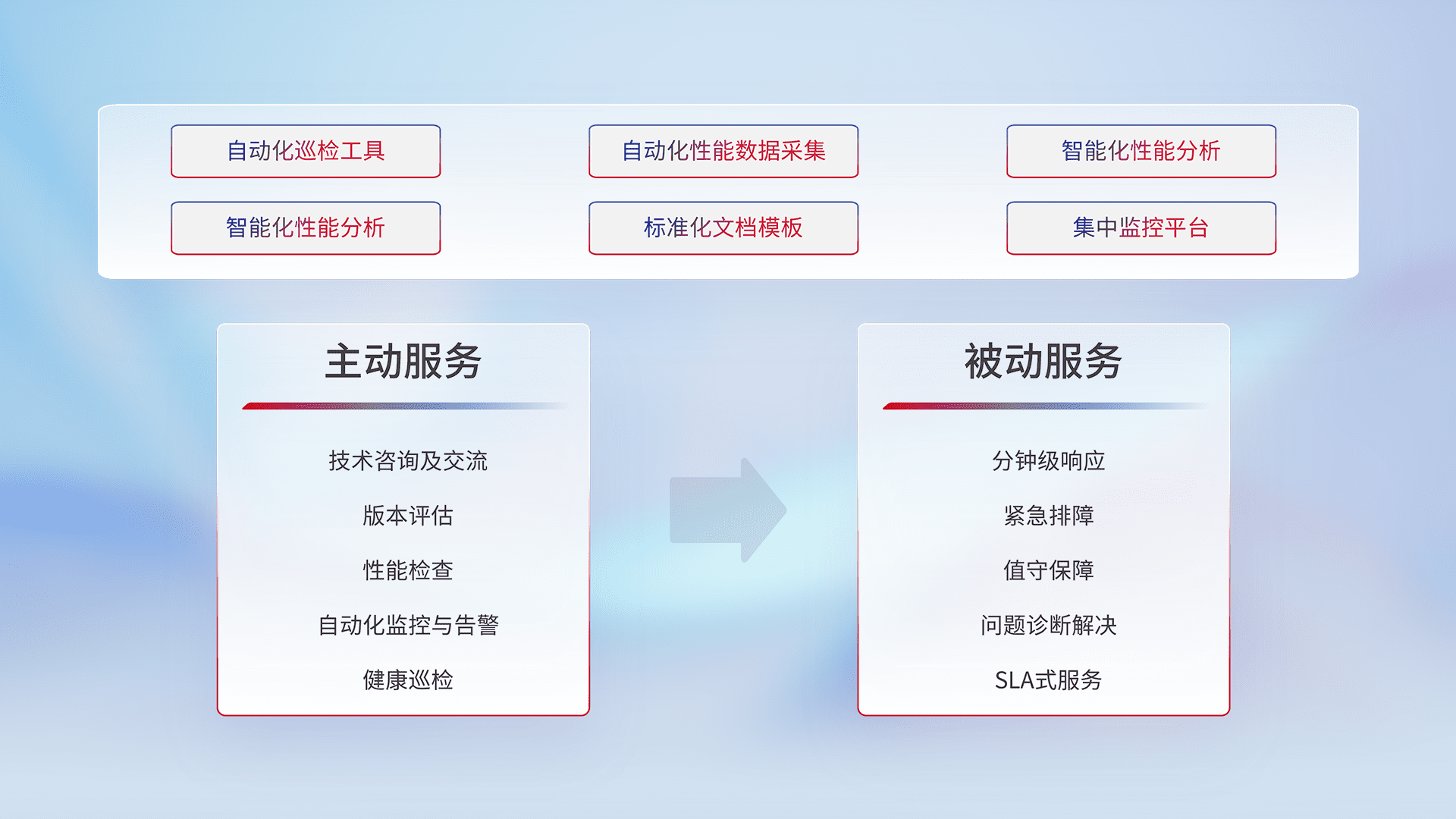 智能化工具和标准化文档,,,,保障服务质量,,,提供主动服务(包含技术咨询、、版本评估、、、性能检查、、、、自动化监控与告警、、健康巡检)和被动服务包含(分钟级响应、、紧急排障、、值守保障、、、、问题诊断解决、、、、SLA服务)。。。