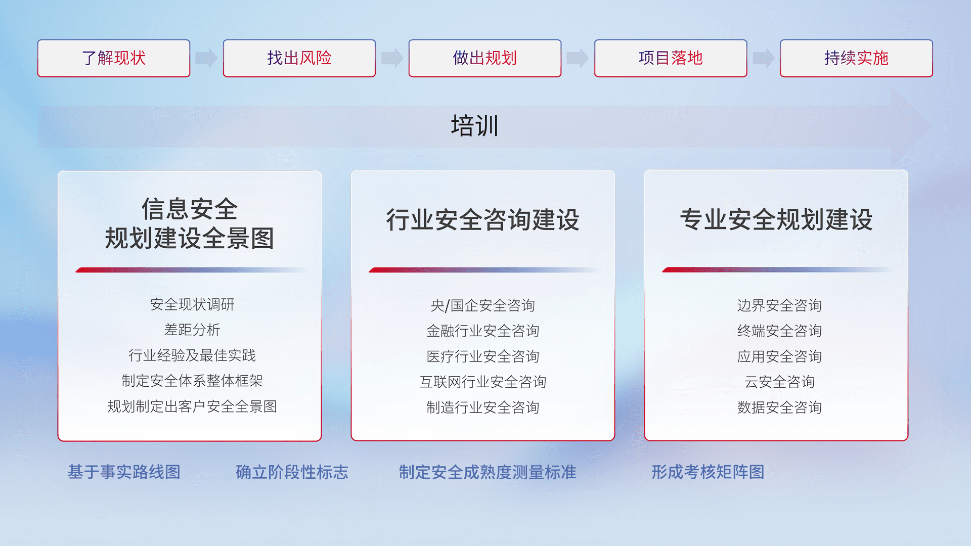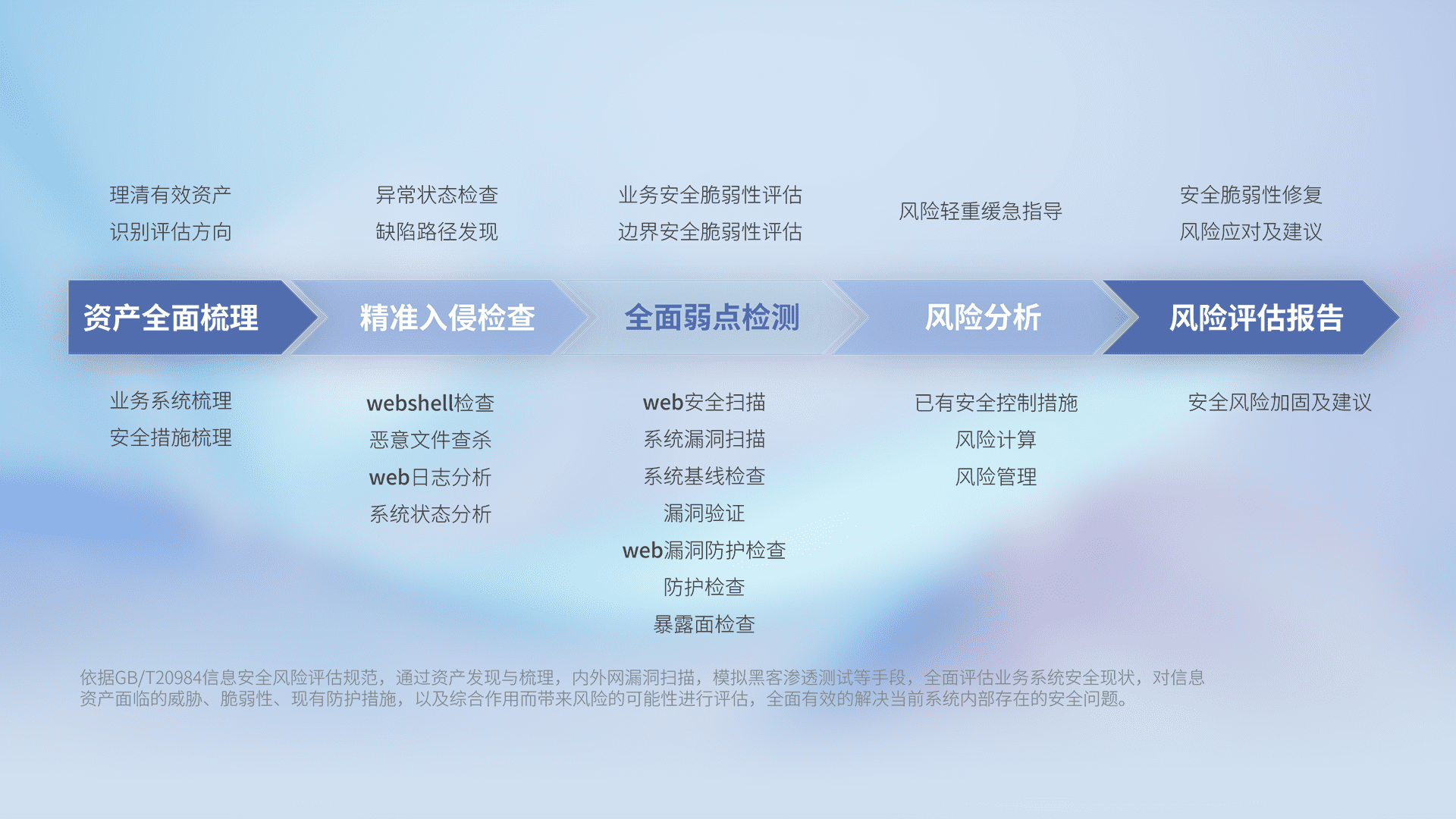 针对客户行业特性,,以专业的安全服务+多厂商联合解决方案提供专属的一站式安全管理服务,,帮助客户全面感知网络空间威胁,,,基于识别、、、检测、、、、分析、、防护、、、、监测、、、响应的服务理论模型,,,,从方案咨询、、、集成交付、、评估验证、、优化加固、、、、运维运营,,致力于为客户提供完整的闭环管理式安全服务。。以实战经验为客户打造高抵御风险的安全体系,,帮助客户发现威胁、、、、对抗威胁、、、、处置威胁,,不断积累安全对抗能力,,,持续保障数字化安全。。